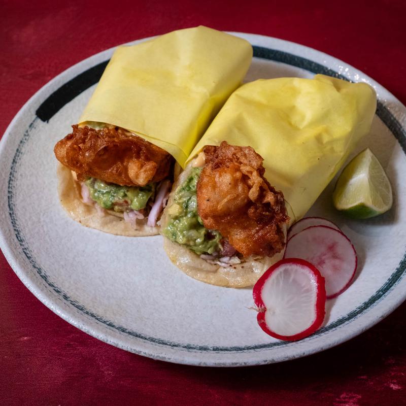 Two battered tilapia tacos topped with mayo dressing and cob & avocado salad.